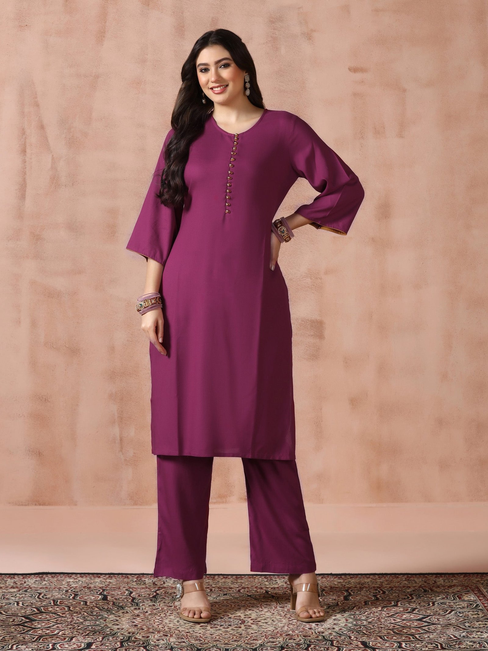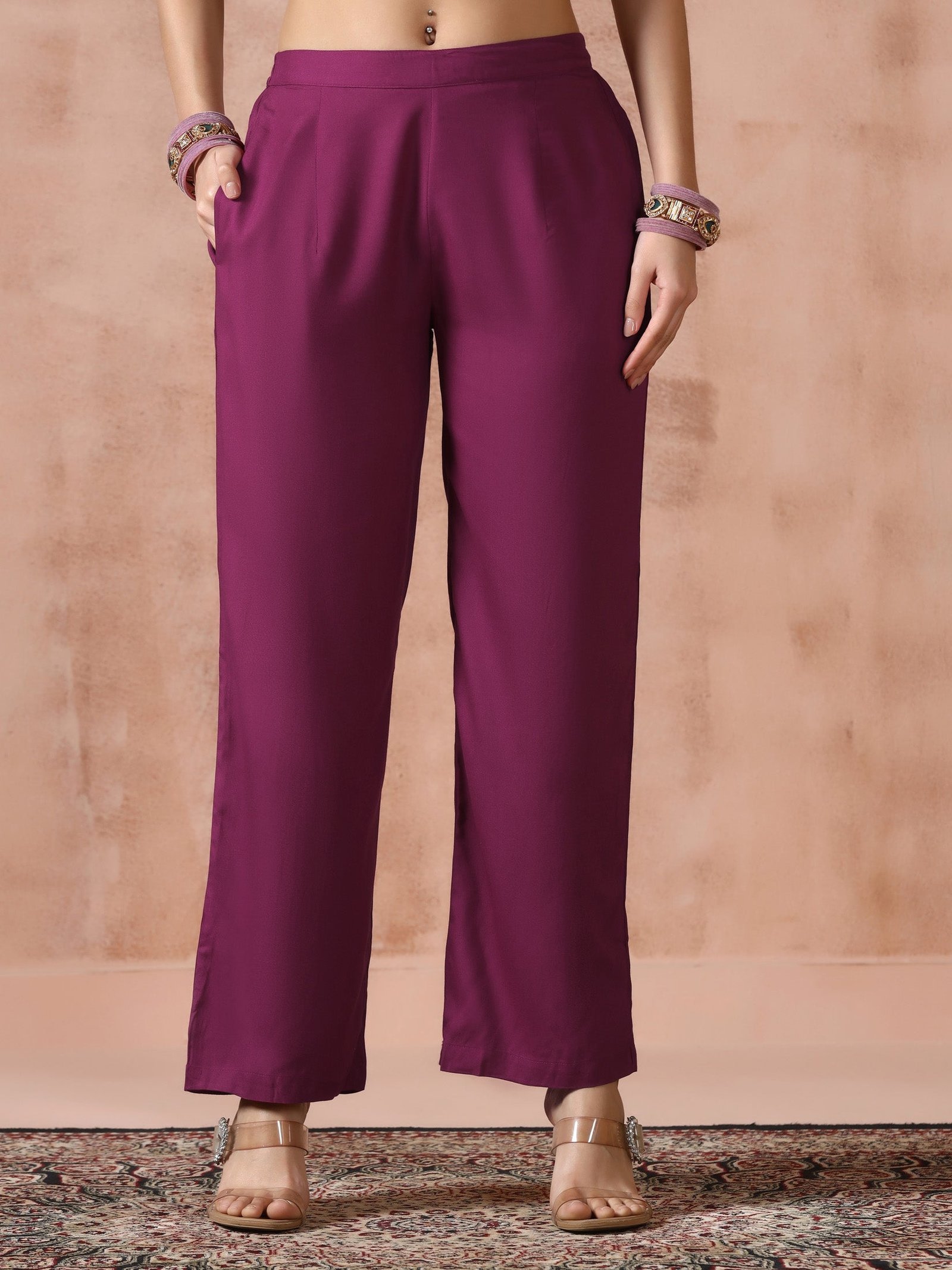 Women Liva Rayon Purple Solid Kurta Comfort Pant with Printed Chanderi Dupatta