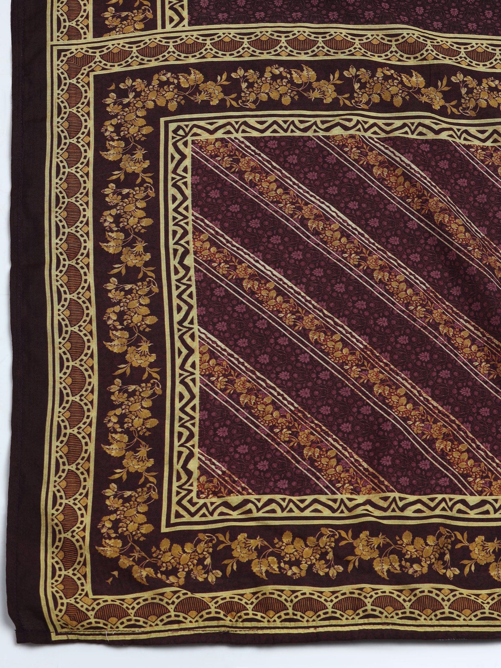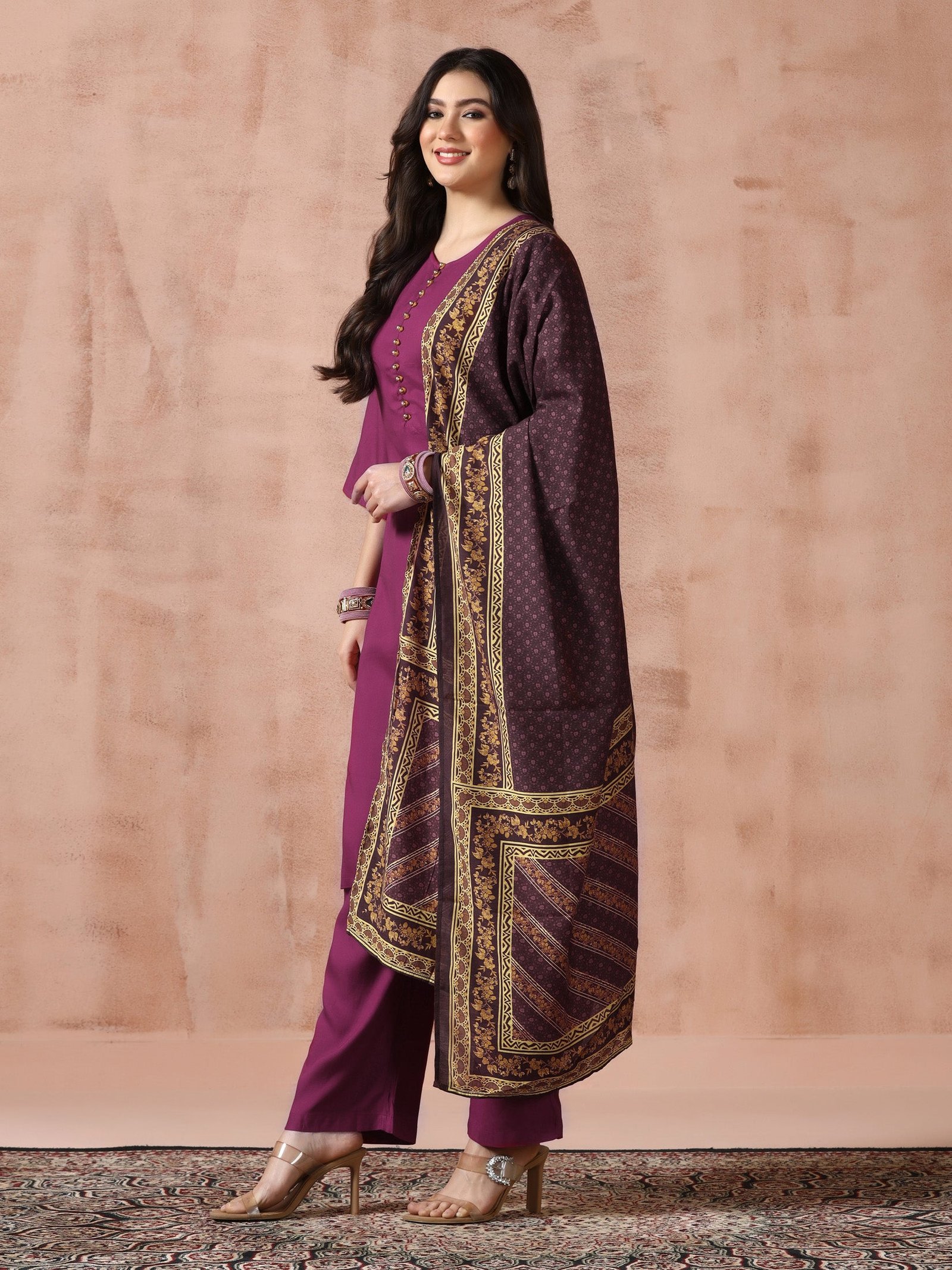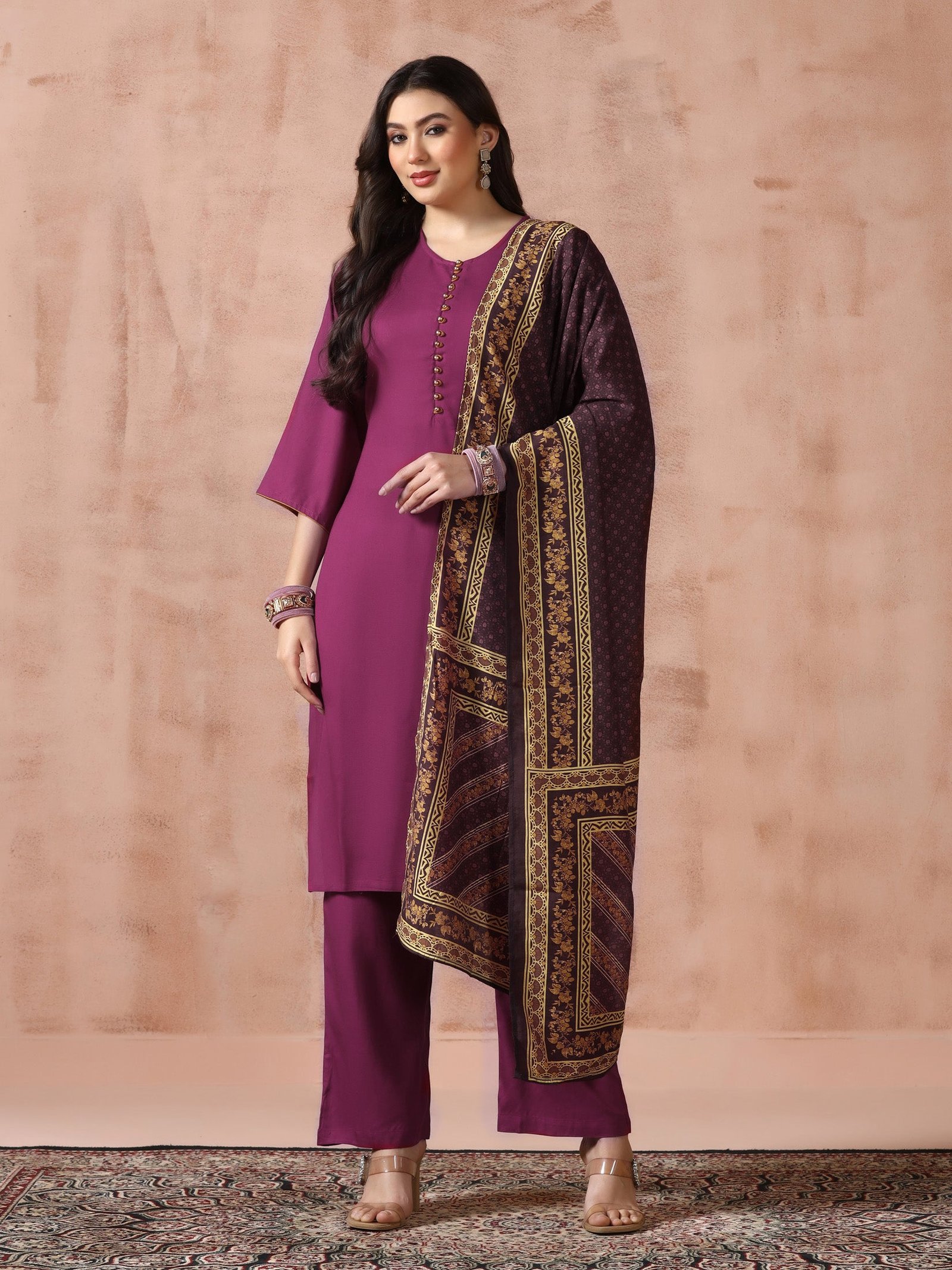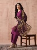 Indulge in refined elegance with this luxurious three-piece set combining rich purple tones and premium fabrics. The Liva rayon kurta drapes beautifully with a soft, lustrous finish that feels gentle against the skin, while the comfort pant ensures unrestricted movement throughout your day. The printed Chanderi dupatta adds an exquisite finishing touch with its intricate detailing and traditional weave. This thoughtfully curated ensemble balances sophistication with comfort, making it perfect for festive occasions, family gatherings, or whenever you want to feel special. The blend of solid and printed elements creates visual interest while maintaining a cohesive, polished appearance that celebrates your unique style.