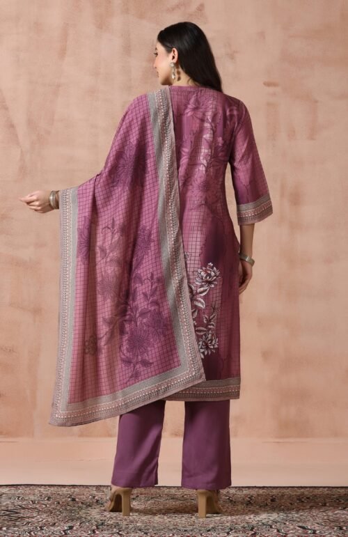• Women Liva Rayon Purple Solid Kurta Comfort Pant with Printed Chanderi Dupatta